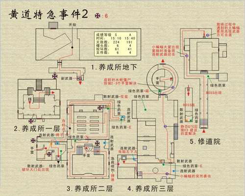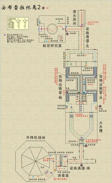 開場是個凹字形走廊,從一頭走到另外頭要解決幾個喪屍,另一頭的盡頭的燈內有本關的急救噴霧。下樓梯後,轉身有兩個喪屍,他們頭上的燈內有個傘廠標誌。出門後會看見第一有一研究員趴在地上,其實他丫的在裝死,等你解決完前面的喪屍後就會變成狂暴SS突然撲過來。