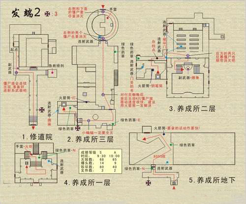 遊戲開場後,掃完現場的喪屍進入下水道,下水道的一盞燈裡有個傘廠標誌。爬出下水道來到建築內,剛爬出來面對的那堵牆上,從右往左數第三盞燈內有第2個標誌。難點:從下水道出來後,會有段錄音,等錄音完後,過道上會出現很多水蛭以及幾個水蛭人。這個時候就要在水蛭人還在遠處時把身邊的水蛭群清理了,一是防止它們成形,二是它們會撲上來影響你的視線,這個時候很容易被水蛭人衝上來攻擊。到門前的時候,會突然衝出一個水蛭人,解決掉後會同時出來兩個,這個時候可以考慮有手雷或者重武器迅速解決。在一個很多水蛭的過道上,進入房間後,打完門前的大堆水蛭,身後寫字檯上的的鋼筆架內有個傘廠標誌。從這個房間的升降梯上去後,右手邊的牆上的有塊版,把上面的東西打掉後可以拿到本關的急救噴霧。記得有個小花園裡有個標誌,具體在哪忘記了,也是昨天晚上試盤時打的,原諒我吧。難點二:在一個地方解決完大量猴子,進入一個圍廊也全是水蛭人,可以使用手雷退散,反正BOSS戰用不到,貌似這關的難點全在水蛭人上了。另外還有2個標誌暫時沒有發現,等待補充。