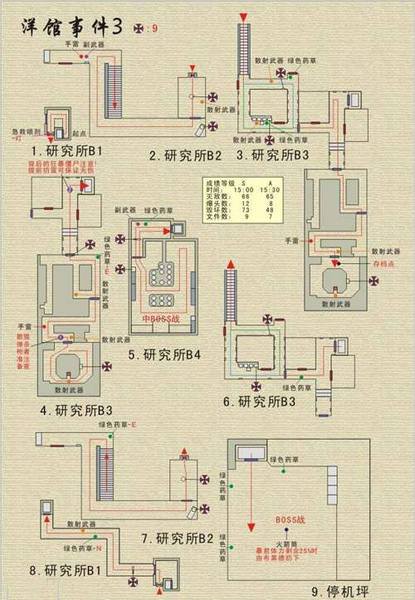 來到電梯面前背後會突然出現一隻Chimera(也叫基美拉,就是大型蒼蠅人啦,以後我都會這麼稱呼它),在來到電源終端房前會一路遇到不少Chimera和狂暴SS。終端房內的另外台電腦內有個傘廠標誌。打開終端後,一路會跑出許多Chimera和Hunter,建議大家不要老惦記著手槍,一直拿把重武器在手裡防身吧。坐電梯下樓後,電梯出來後正面的燈內有個傘廠標誌。進入將要遇到威斯克的研究室,在進入研究室的電子門後,正前方側對你的電腦內有個標誌。劇情結束後,要用QTE躲過暴君的攻擊,然後就一直盯著暴君的弱點心臟打就可以,累積到一定傷害後,跑出研究室。逃脫的裡路都是速度快的敵人為主,建議使用重武器,因為基本都是拐角和正反遇敵。