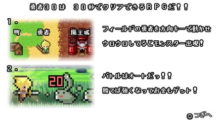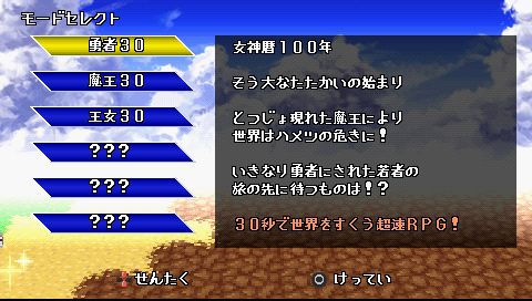 在30秒內挑戰為世間帶來災禍的51個魔王之超快速RPG! 遊戲特色: 以4個觀點描繪跨越500年人類與魔王的壯烈戰鬥故事,在30秒內挑戰為世間帶來災禍的51個魔王之超快速RPG! 由名留青史的4種遊戲模式「勇者30(RPG)」「王女30(STG)」「魔王30(即時模擬)」「騎士30(ACT)」所組成,可盡情享受各式遊戲類型及豐富的反覆遊玩要素。