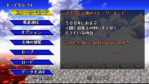故事模式:單人模式。長達500年的,關於人類與超魔王之間的戰鬥的壯大的物語。這是場沒有終結的戰鬥嗎?