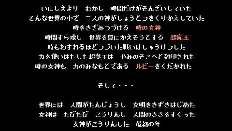 遠古的過去,唯有時間存在,在那樣的世界中,有二位神祗不斷持續著衝突。一位元是不停記錄時間的—時之女神、一位是破壞時間,將世界回歸於無的—超魔王。連時間都被遺忘的戰鬥終於迎來了終結,用盡力量的超魔王,被封印在了黑暗的彼端。時之女神的力量之源,紅寶石也被打碎了。