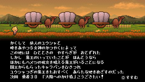 就這樣,旅行的勇者大人與操縱時間之女神一起,給這片土地帶來了短暫的安詳與和平,但是,(超)魔王如果真的還活著的話,就一定還有其他會詠唱毀滅之咒文的魔王存在。率領著國王贈與的商隊,勇者為了打倒下一個魔王而向新的目的地邁進。