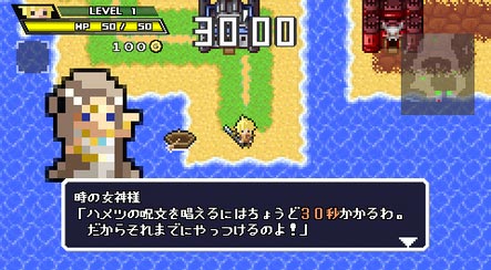時之女神:勇者大人,暫且就先辛苦你了!雖然是多虧了我力量,不過可真是幹的漂亮呢!啊!作為升級迅速的代價,一天過後級別就會退回1級這點請注意哦。果然這就是便利的副作用呢,這也是沒法避免的事啊,真可怕呢。比起這件事,似乎是誰將毀滅的咒文告訴了那個魔王呢。這樣下去的話,說不定還會有新的魔王出現想要來毀滅世界呢。這可真麻煩不是麼?看來我們二人不得不去阻止魔王的計畫了呢!喂喂,不要露出一副不想幹的表情嘛~出發吧!勇者大人!!