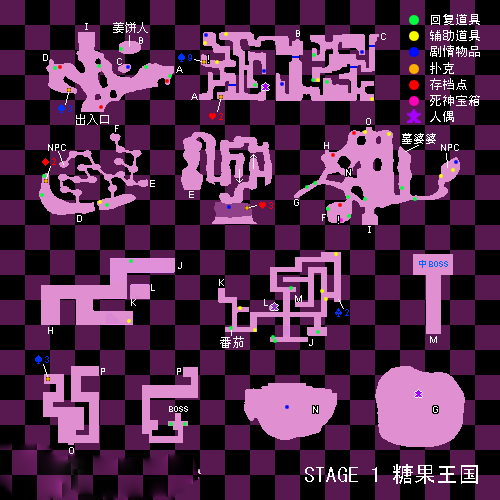 7.通過L處的梯子回到上層,繼續前行,在半路會被強制傳送至下層,在右側又會遇到糖塊,將其擊敗後得到梅花10。穿過右邊的隱藏通道上梯子,不要選擇上邊的路線,在左側盡頭的牆上會遇到中BOSS青蛙武士,戰鬥勝利後新的通路出現,上梯子後會見到裝有第二個過關道具的寶箱。