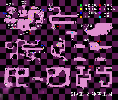 9.接下來就要去墓婆婆那裏合成鑰匙,以及在前往冰雪城堡的途中用爆彈炸毀K處的冰柱,探索裏面的洞穴並得到又一個人偶,通過P處也可以獲得黑桃4。