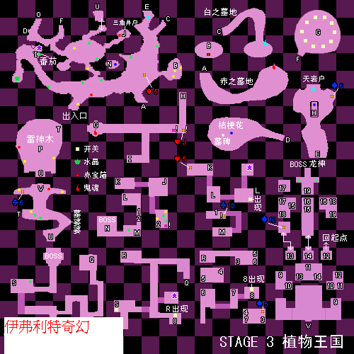 8.從主場景的O點出發,在一段劇情後進入雷神木,走右邊的道路上樓,踩下二樓底部的開關上方的樓梯就會出現,上去後有數個傳送點,進入3號傳送點可在寶箱中得到黑桃5,之後進入左下角的7號傳送點,去右邊踩開關,8號傳送點就會出現,來到對面後先去上邊取的本關的第三個人偶。觸動樓梯S下方的開關,通向中BOSS蛇怪房間的路線就會打開,將其擊敗後可獲得第三個過關道具。