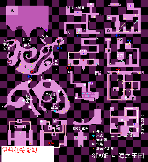10.先不要急著去位於場景上方I處的神殿入口,通過下端的B點回到開始場景水母父子的房間,並以路向下對隱藏在某個洞窟的鯊魚進行最後的掃蕩,戰勝後獲得第二個過關道具。