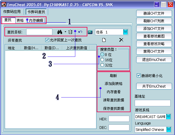 EC的全稱是Emulator Cheats Tools,譯為模擬器作弊碼工具。所謂“金手指”就是指含有某個遊戲作弊碼集合的作弊檔庫,在EC中,這類文件的副檔名為“.cht”
