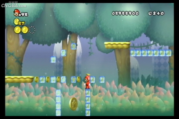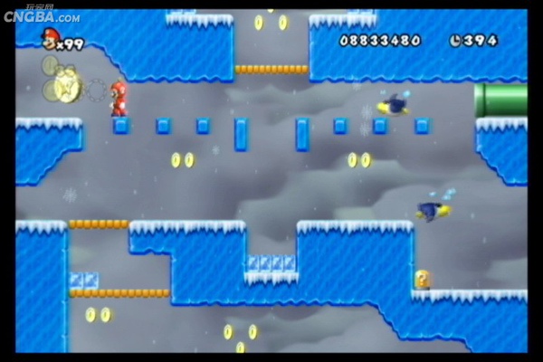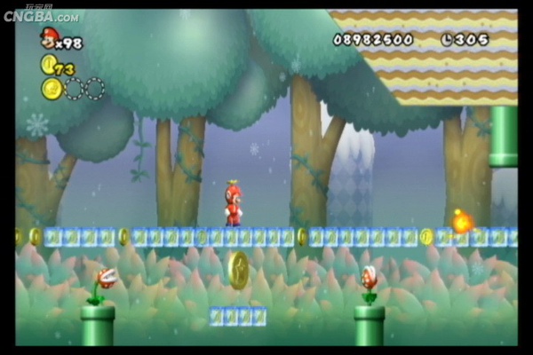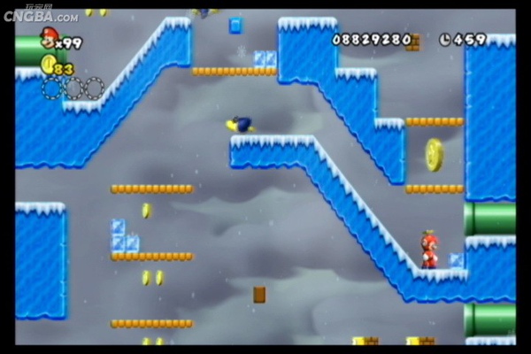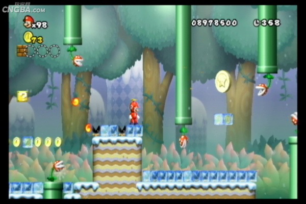 快到終點時有一個金色管道和一個紅色管道,把紅色管道下的食人花凍住,進紅色管道。